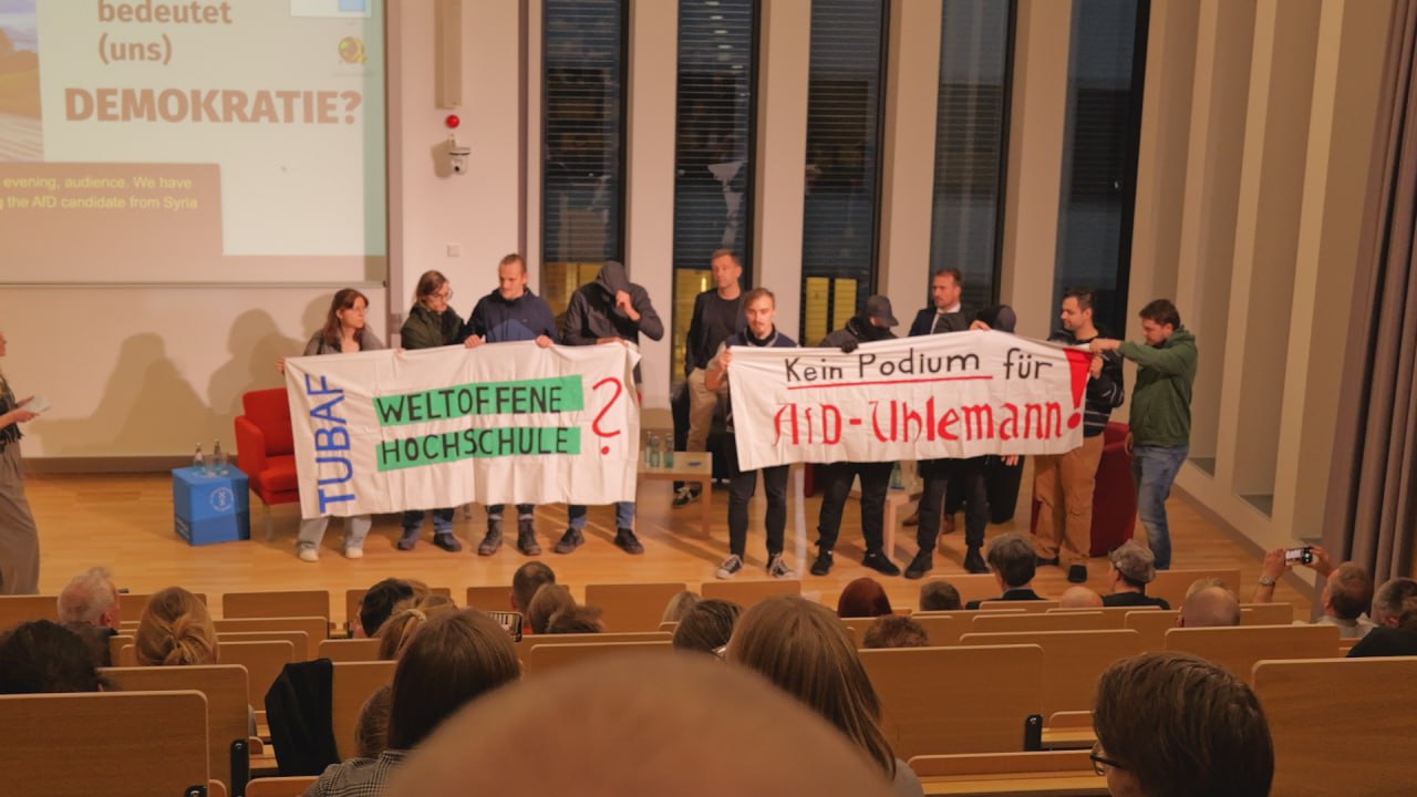 Am 22.10.2025 fand in Freiberg ein Wahlforum anlässlich des zweiten Wahlgangs zur Freiberger Oberbürgermeisterwahl statt. Gleich zu Beginn des Wahlforums der TUBAF stürmte eine Gruppe offensichtlicher Linksextremisten die Veranstaltung. Dabei handelte es sich um eine Gruppe, die sich „Studis gegen Rechts“ nennt. Sie forderten den Ausschluss des AfD-Kandidaten Jens Uhlemann von der Debatte. Die Straftäter agierten teilweise vermummt. Ein vollständiges Video des Vorfalls ist nachfolgend verlinkt: