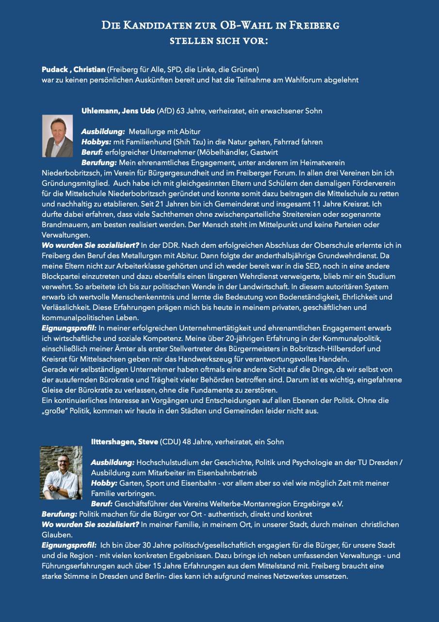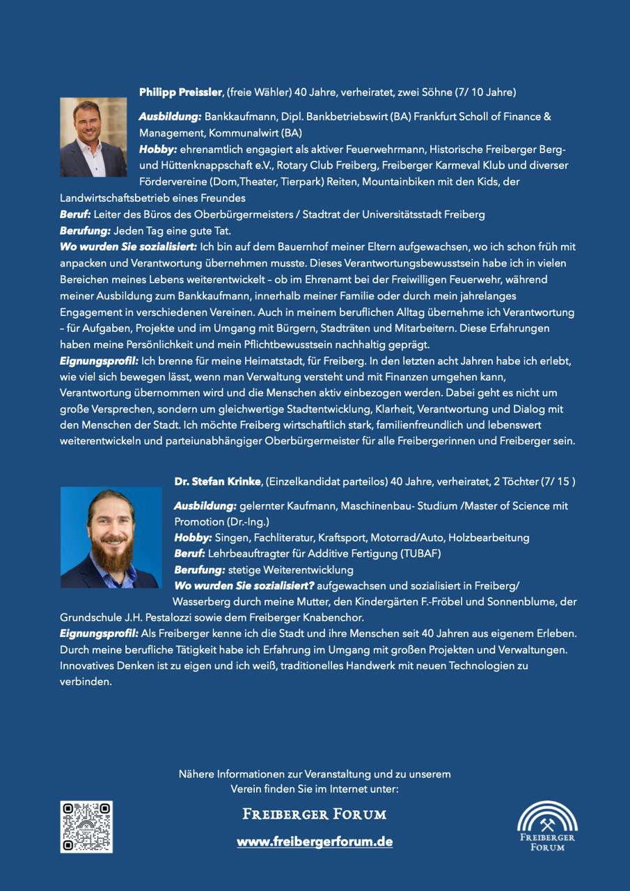 Am 28. August, ab 19 Uhr im Städtischen Festsaal, findet das "Wahlforum" bzw. Podiumsdiskussion des Freiberger Forums anlässlich OB-Wahl statt. Geladen sind alle Kandidaten. Diese Veranstaltung wird vom Freiberger Forum e.V. organisiert. Zugesagt haben vier.