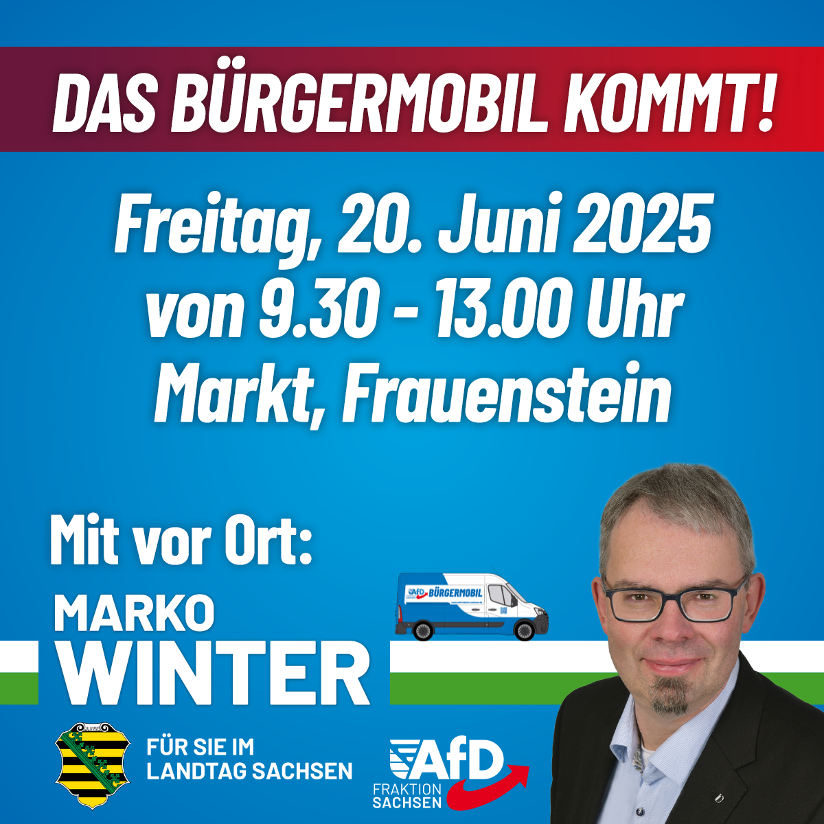 Wir sind für die Bürger da, nicht nur in Dresden, sondern auch im Wahlkreis. So sind wir am 20. Juni in Frauenstein auf dem Markt. Ab ca. 9.30 Uhr bis ca. 13.00 Uhr sind wir da.