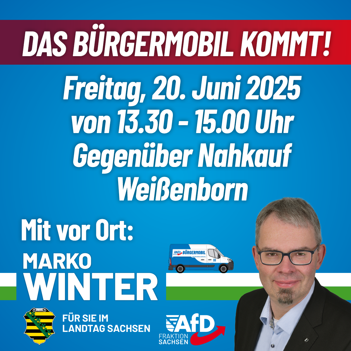 Wir sind für die Bürger da, nicht nur in Dresden, sondern auch im Wahlkreis. So sind wir am 20. Juni in Weissenborn gegenüber Nahkauf. Ab ca. 13.30 Uhr bis ca. 15.00 Uhr sind wir dort.