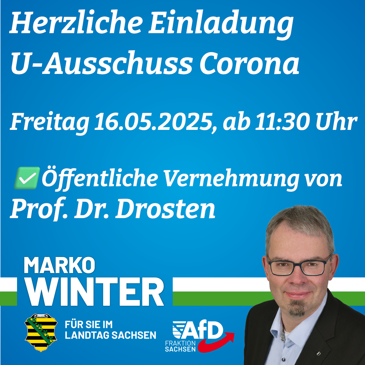 Am 21. August 2025 findet die nächste öffentliche Anhörung im Corona-Untersuchungsausschuss statt, mit Prof. Drosten und Tom Lausen. Das wird im Plenarsaal des Sächsischen Landtags sein.