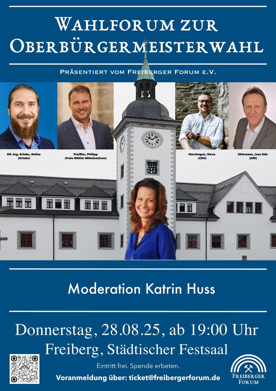 Am 28. August, ab 19 Uhr im Städtischen Festsaal, findet das "Wahlforum" bzw. Podiumsdiskussion des Freiberger Forums anlässlich OB-Wahl statt.